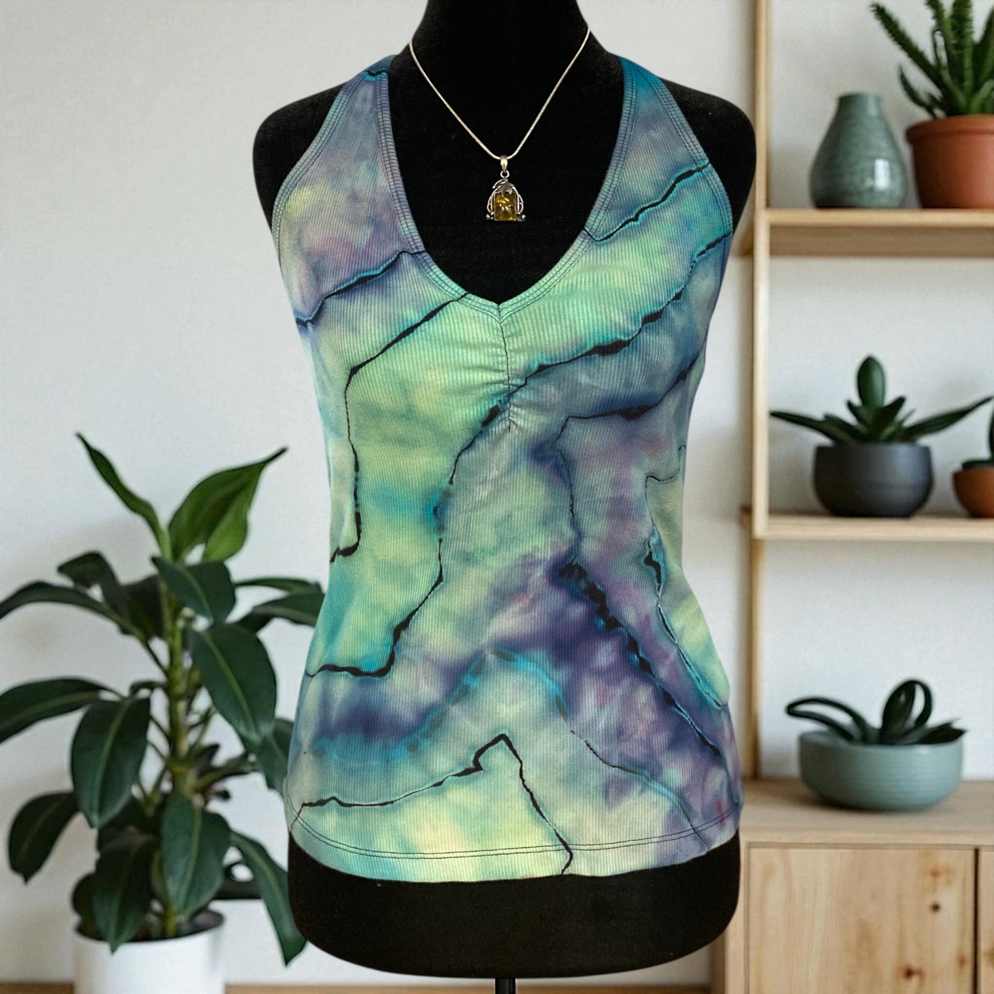 This Reverse Geode Design Old Navy Racer Back Tank is a small/tall and has a shelf bra. Which is key for comfort. She is 96% Cotton, 4% Spandex and 21" long. The halter style of these racer back designs are an attractive look for everyone.