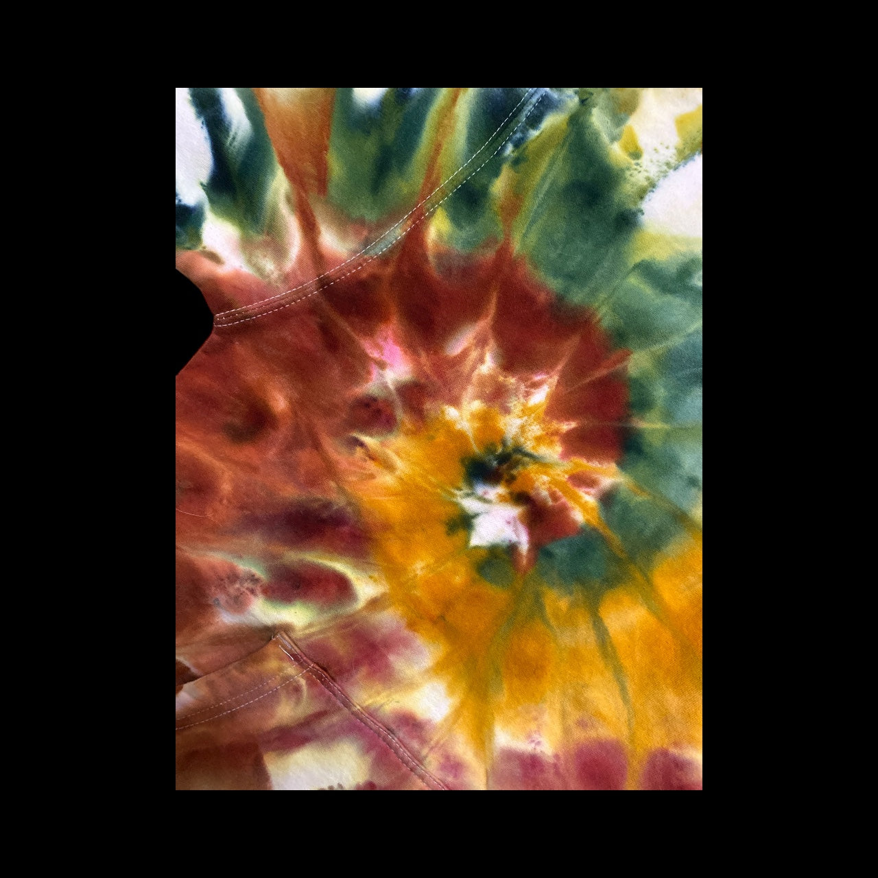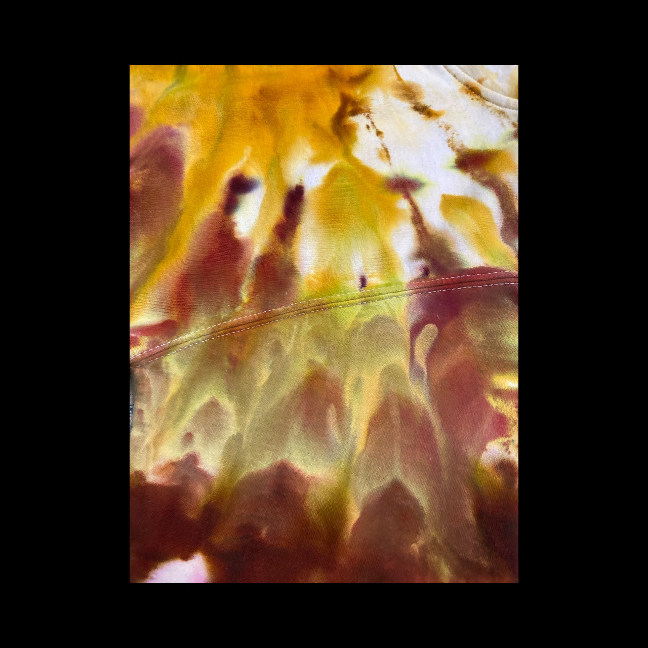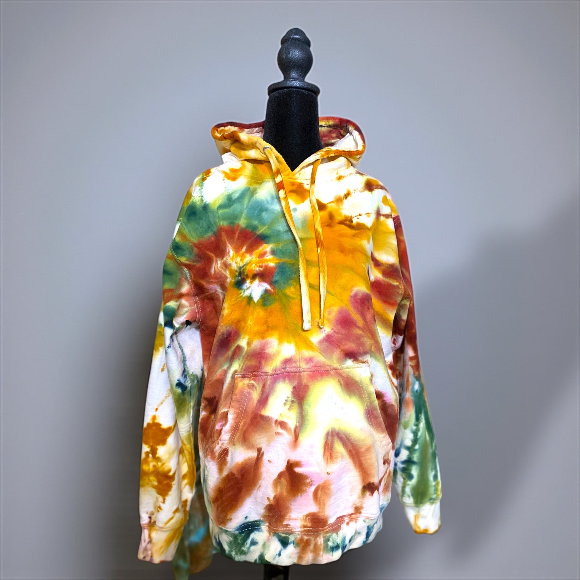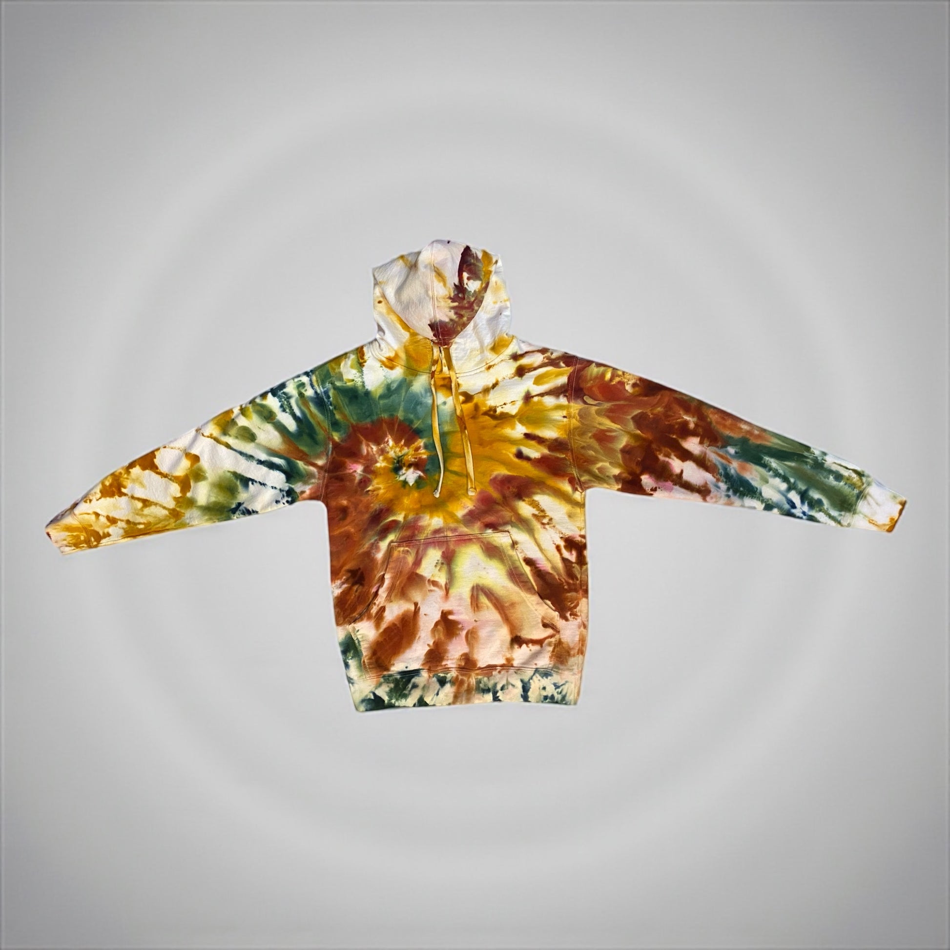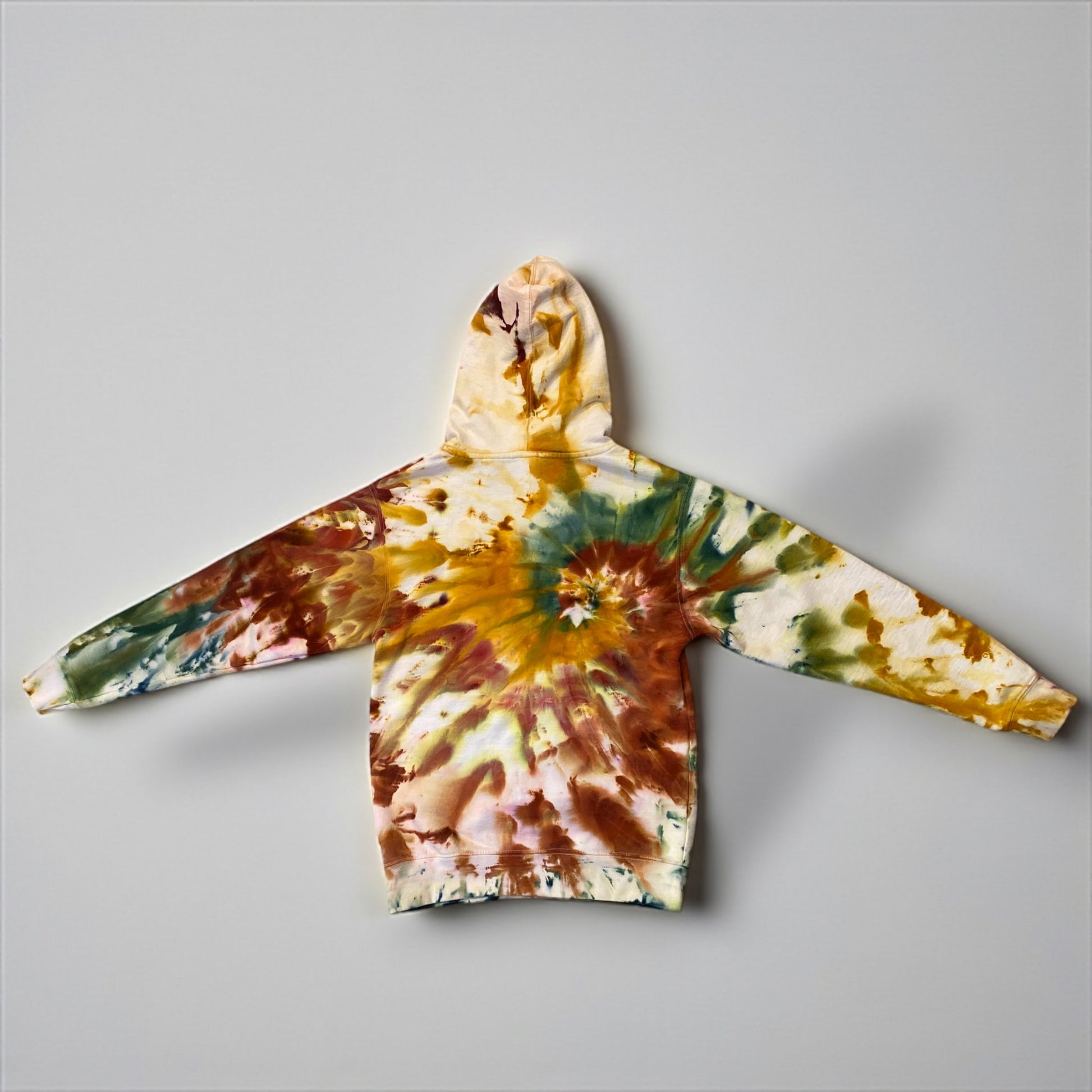 Classic spiral design on a unisex, medium weighted hoodie. I think this design turned out to look like falling leaves. It's a small that has a marsupial pouch and a thick draw string around the hood.